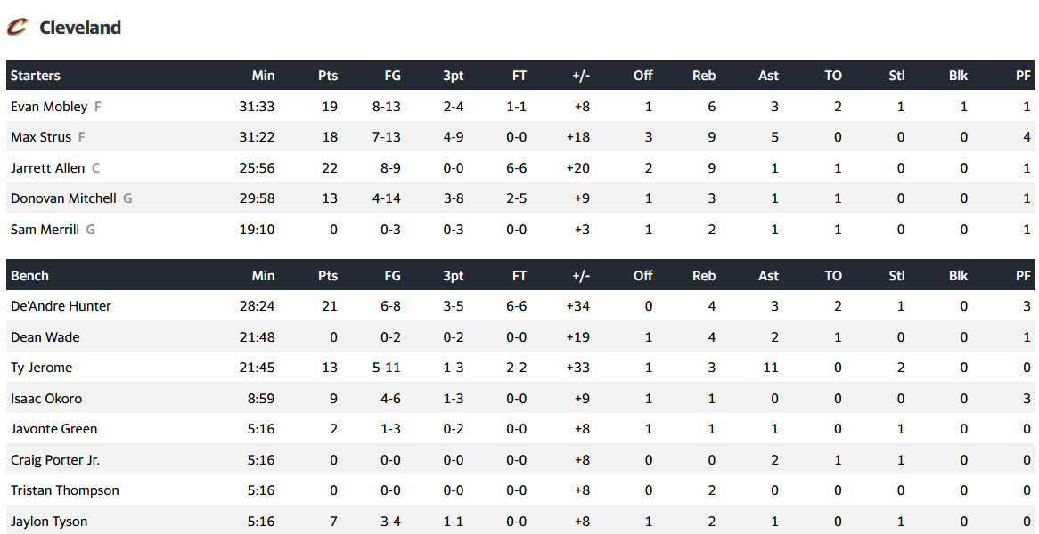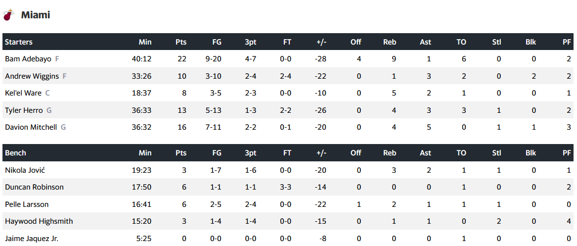 Από την ομάδα του Μαϊάμι ξεχώρισε ο Μπαμ Αμπεμπάγιο με 22 πόντους και 9 ριμπάουντ, ενώ ακολουθεί ο Ντάβιον Μίτσελ με 16 πόντους και 5 ασίστ.