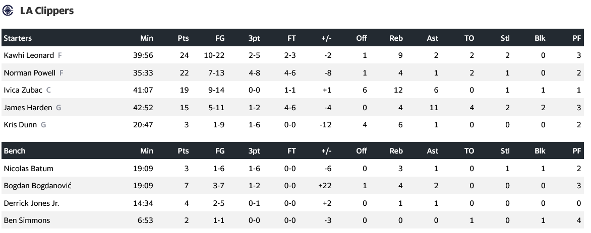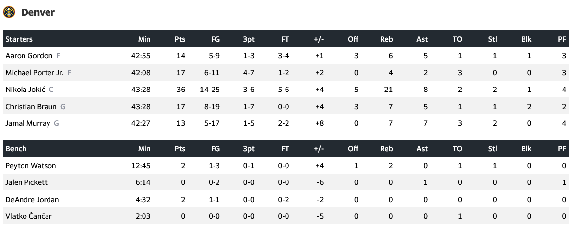 Κορυφαίος για τους νικητές ήταν ο Νίκολα Γιόκιτς, που ολοκλήρωσε τον αγώνα έχοντας 36 πόντους, 21 ριμπάουντ και 8 ασίστ, με τους Μάικλ Πόρτερ Τζ. (17π,4ρ, 2σ) και Κρίστιαν Μπράουν (17π, 7ρ, 5ασ) να τον πλαισιώνουν. Από πλευράς γηπεδούχων ξεχώρισε ο Καουάι Λέοναρντ με 24 πόντους και 9 ριμπάουντ.