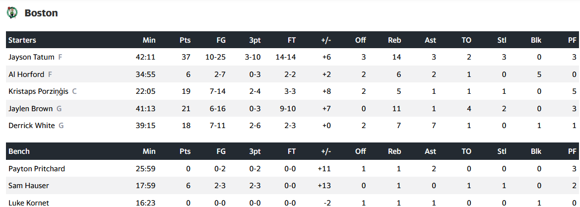 Από τους νικητές, μεγάλος πρωταγωνιστής και πρώτος σκόρερ ήταν ο Τζέισον Τέιτουμ με 37 πόντους και 14 πόντους, ενώ ακολουθεί ο Τζέιλεν Μπράουν με 21 πόντους και 11 ριμπάουντ.
