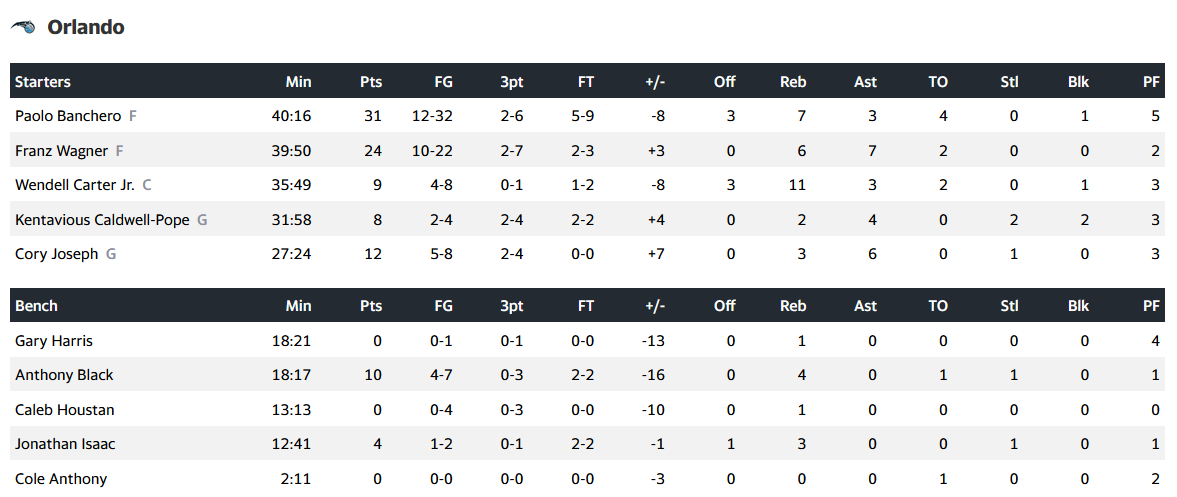 Από την άλλη, από την ομάδα του Ορλάντο ξεχώρισε ο Πάολο Μπανκερό με 31 πόντους και 7 ριμπάουντ, καθώς και ο Φραντζ Γουάνγκερ με 24 πόντους, 7 ασίστ και 6 ριμπάουντ.