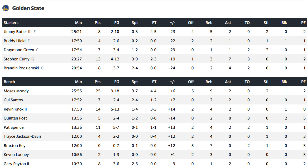 Από το Γκόλντεν Στέιτ ξεχώρισε ο Μούζες Μούντι με 25 πόντους και 9 ριμπάουντ, καθώς και ο Στέφεν Κάρι με 13 πόντους και 7 ασίστ.