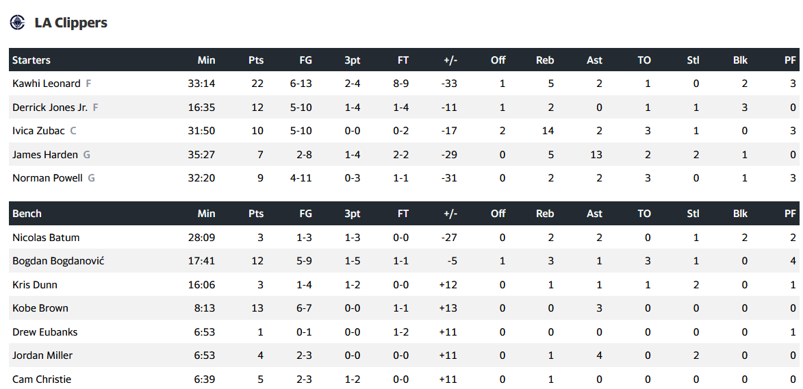 Από την ομάδα του Λ.Α. ξεχώρισε ο Κάουι Λέοναρντ με 22 πόντους και 5 ριμπάουντ, καθώς και ο Ίβικα Ζούμπακ με 10 πόντους και 14 ριμπάουντ.