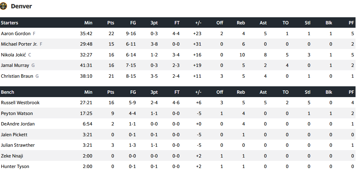 Από τους νικητές πολύ καλή εμφάνιση σημείωσε ο Άρον Γκόρντον με 22 πόντους και 5 ασίστ και ο Νίκολα Γιόκιτς με 16 πόντους, 10 ριμπάουντ και 8 ασίστ.