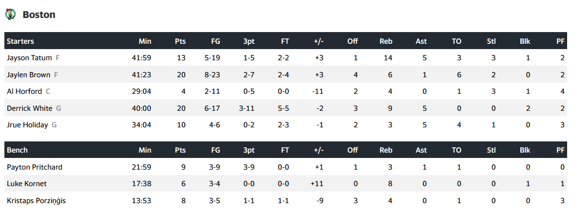 Από την άλλη, από τους Σέλτικς πολύ καλή εμφάνιση σημείωσε ο Τζέιλεν Μπράουν με 20 πόντους και 6 ασίστ και ο Ντέρικ Γουάιτ με επίσης 20 πόντους και 9 ριμπάουντ.