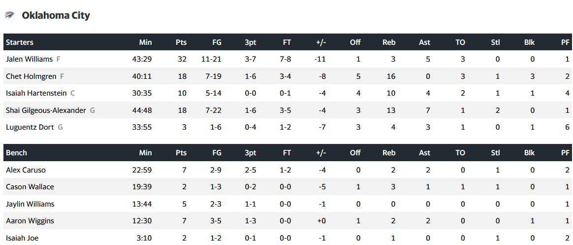 Από την Οκλαχόμα, ξεχώρισε ο Τζέιλεν Γουίλιαμς με 32 πόντους και ασίστ, ενώ ακολουθεί ο Σάι Γκίλτζεους Αλεξάντερ με 18 πόντους, 13 ριμπάουντ και 7 ασίστ.