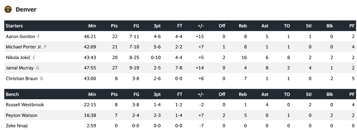 Από τους νικητές, πρωταγωνιστής ήταν ο Νίκολα Γιόκιτς με 20 πόντους, 16 ριμπάουντ και 6 ασίστ, καθώς και ο Τζαμάλ Μουράι με 27 πόντους και 8 ασίστ.