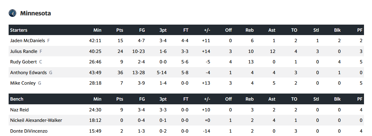Από τους νικητές ξεχώρισε ο Άντονι Έντουαρντς με 36 πόντους και από 4 ασίστ και ριμπάουντ, καθώς και ο Τζούλιους Ραντλ με 24 πόντους, 12 ασίστ και 10 ριμπάουντ.