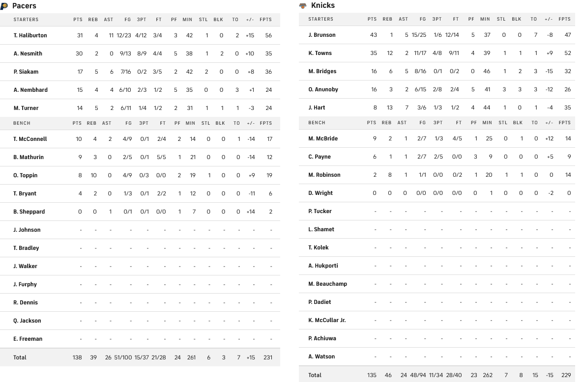 Οι Πέισερς επέστρεψαν από το -17 της τέταρτης περιόδου και -14 στα τρία τελευταία λεπτά, έστειλαν το ματς στην παράταση με ένα τρελό σουτ του Χαλιμπέρτον και στον έξτρα χρόνο πανηγύρισαν το 1-0 έναντι των Νικς με σκορ 135-138.
