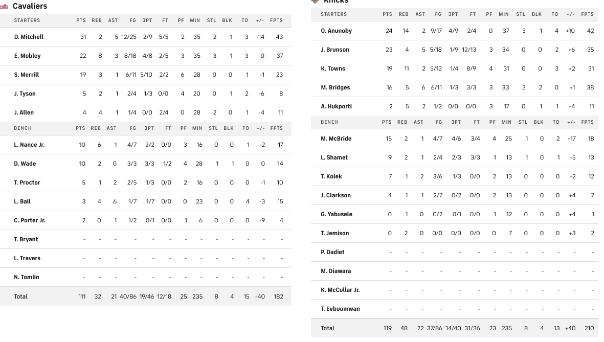 Με τους Ανουνόμπι (24 πόντοι, 14 ριμπάουντ) και Τάουνς (19 πόντοι, 11 ριμπάουντ) να κάνουν double – double και τον Μπράνσον να έχει 23 πόντους, οι Νικς επικράτησαν με 119-111 των Καβαλίερς, οι οποίοι είχαν τον Μίτσελ με 31 πόντους και τον Μόμπλεϊ με 22.