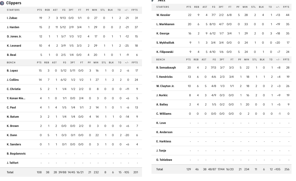 Εύκολο το έργο των Τζαζ που επικράτησαν με +21 (129-108) των Κλίπερς, με τον Κέσλερ να έχει 22 πόντους, εννέα ριμπάουντ και τέσσερις ασίστ και τον Σέσναμπο να ακολουθεί με 20. Για το Λος Άντζελες, ο Ζούμπατς είχε 19 πόντους και επτά ριμπάουντ, με τον Χάρντεν να προσθέτει 15.