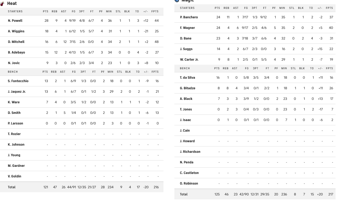 Νίκη για τους Μάτζικ, που επιβλήθηκαν με 125-121 των Χιτ. Βάγκνερ και Μπανκέρο είχαν από 24 πόντους, με τον δεύτερο να κατεβάζει και 11 ριμπάουντ, ενώ ο Μπέιν είχε 23 πόντους.