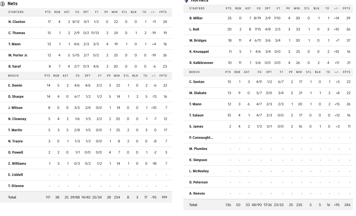 25 πόντοι και επτά ασίστ, ήταν ο απολογισμός του Μπράντον Μίλερ, με τον ΛαΜέλο Μπολ να έχει 20 πόντους και οκτώ ασίστ. Από πλευράς Μπρούκλιν, ο Κλάξτον είχε 17 πόντους.