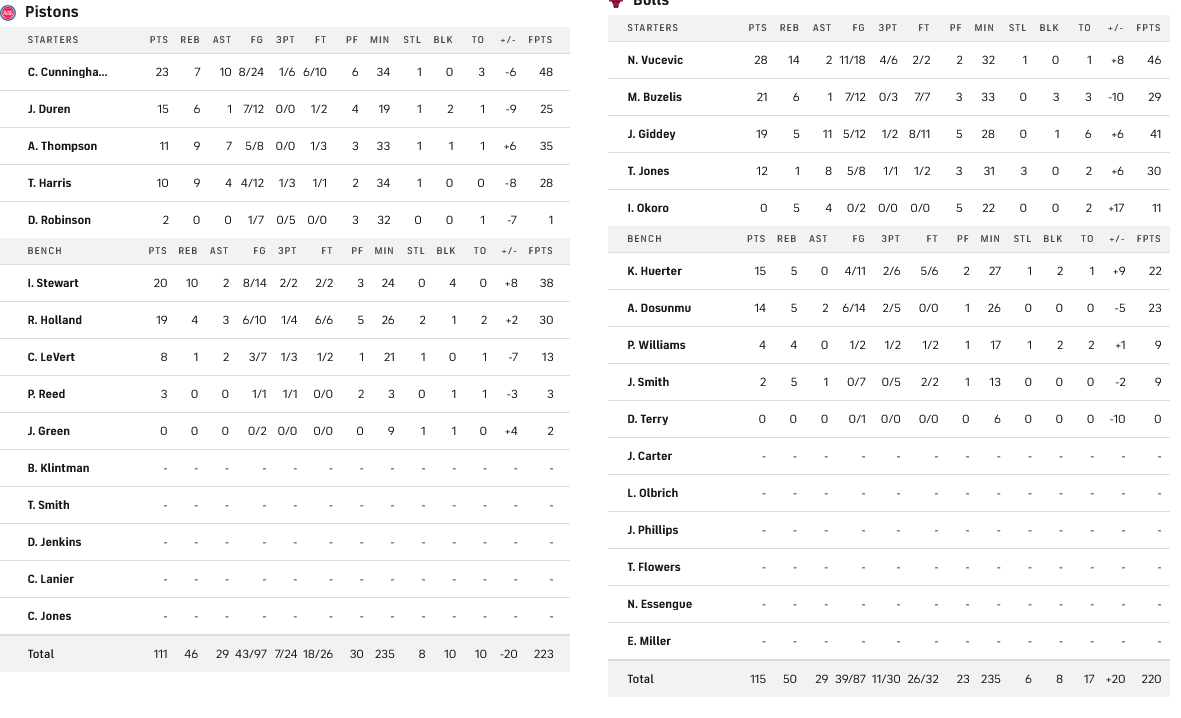 Με τον Βούτσεβιτς να… παρασέρνει τους αντιπάλους του, με 28 πόντους και 14 ριμπάουντ, οι Μπουλς επικράτησαν με 115-111 των Πίστονς. 21 πόντους πρόσθεσε ο Μπουζέλις, ενώ ο Γκίντι έκανε double – double με 19 πόντους και 11 ασίστ. Για το Ντιτρόιτ, ο Κάνιγχαμ είχε 23 πόντους και 10 ασίστ.