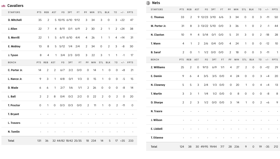 Οι Κλίβελαντ Καβαλίερς πέτυχαν σπουδαία νίκη στην έδρα των Νετς. Ο Ντόνοβαν Μίτσελ ήταν σε εξαιρετικό βράδυ, πετυχαίνοντας 35 πόντους και 5 ασσίστ, με τους Άλεν και Μερίλ να πετυχαίνουν επίσης από 22 πόντους ο καθένας. Για τους Νετς ο Καμ Τόμας σημείωσε 33 πόντους με 9 ασίστ και ο Μάικλ Πόρτερ 31 πόντους και 8 ριμπάουντ αλλά δεν ήταν αρκετοί για να φέρουν την πρώτη νίκη στην ομάδα τους.