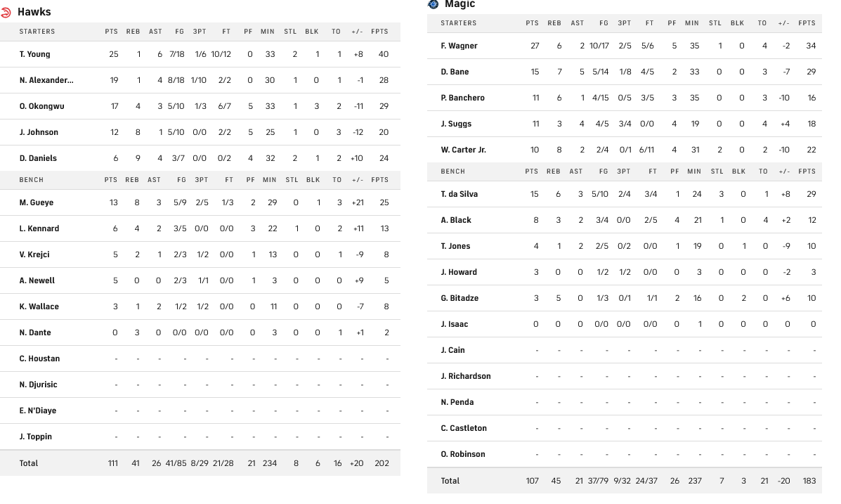 Οι Χοκς πέρασαν από το Ορλάντο με 107-111, κάνοντας το 2-0. Πρωταγωνιστής των Ατλάντα ήταν ο Τρέι Γιανγκ με 25 πόντους, ενώ για τους Μάτζικ ξεχώρισε μόνο ο Φρανζ Βάγκνερ με 27 πόντους και 6 ριμπάουντ.