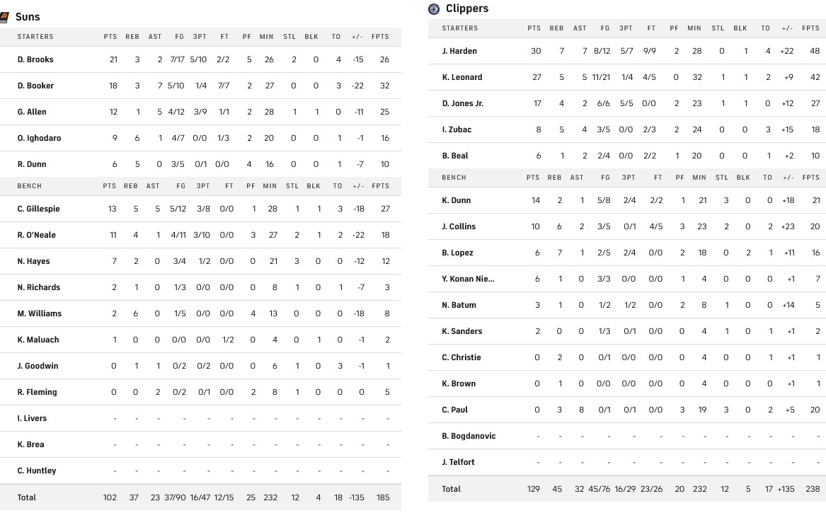 Οι Κλίπερς πέτυχαν σπουδαία νίκη κόντρα στους Σανς με 129-102 και έκαναν το 1-1 στο φετινό ΝΒΑ. Ο Χάρντεν ήταν φοβερός για τους Λος Άντζελες με 30 πόντους, 7 ριμπάουντ και 7 ασίστ, με τον Καουάι Λέοναρντ να τον ακολουθεί με 27 πόντους. Από πλευράς Σανς, σε... ρηχά νερά κινήθηκε ο Ντέβιν Μπούκερ που πέτυχε 18 πόντους, την ώρα που ο Ντίλον Μπρουκς σημείωσε 21 πόντους.