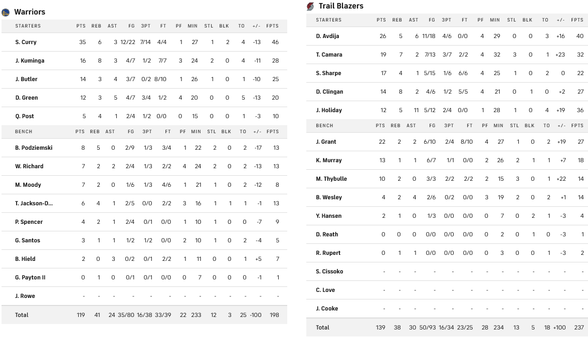 Οι Μπλέιζερς «έριξαν» 20αρα στους Γουόριους κερδίζοντας με 139-119 εντός έδρας. Κορυφαίος των γηπεδούχων ήταν ο Άβντιγια με 26 πόντους, την ώρα που ο Κάρι με 35 πόντους δεν ήταν αρκετός για τους Γκόλντεν Στέιτ.