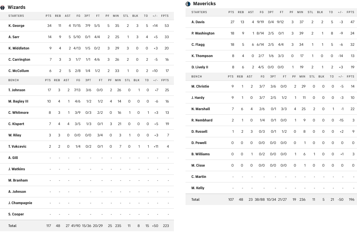 Οι Γουίζαρντς έφυγαν με νίκη από την έδρα των Μάβερικς με 107-117, έχοντας σε εξαιρετική βραδιά τον Τζορτζ με 34 πόντους και 11 ριμπάουντ. Από πλευράς των γηπεδούχων μόνο ο Άντονι Ντέιβις προσπάθησε να κάνει «κάτι» με 27 πόντους και 13 ριμπάουντ.