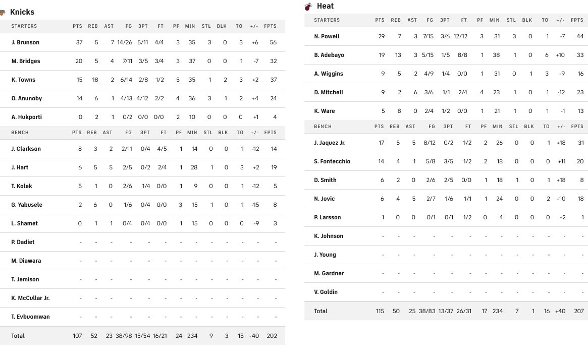 Την δύναμη της έδρας τους εκμεταλλεύτηκαν οι Χιτ, που λύγισαν με 115-107 τους Νικς, με κορυφαίο τον Νόρμαν Πάουελ με 29 πόντους, επτά ριμπαόυντ, τρεις ασίστ και ισάριθμα κλεψίματα. Από πλευράς Νικς, ο Μπράνσον ήταν ασταμάτητος με 37 πόντους, πέντε ριμπάουντ και επτά ασίστ.