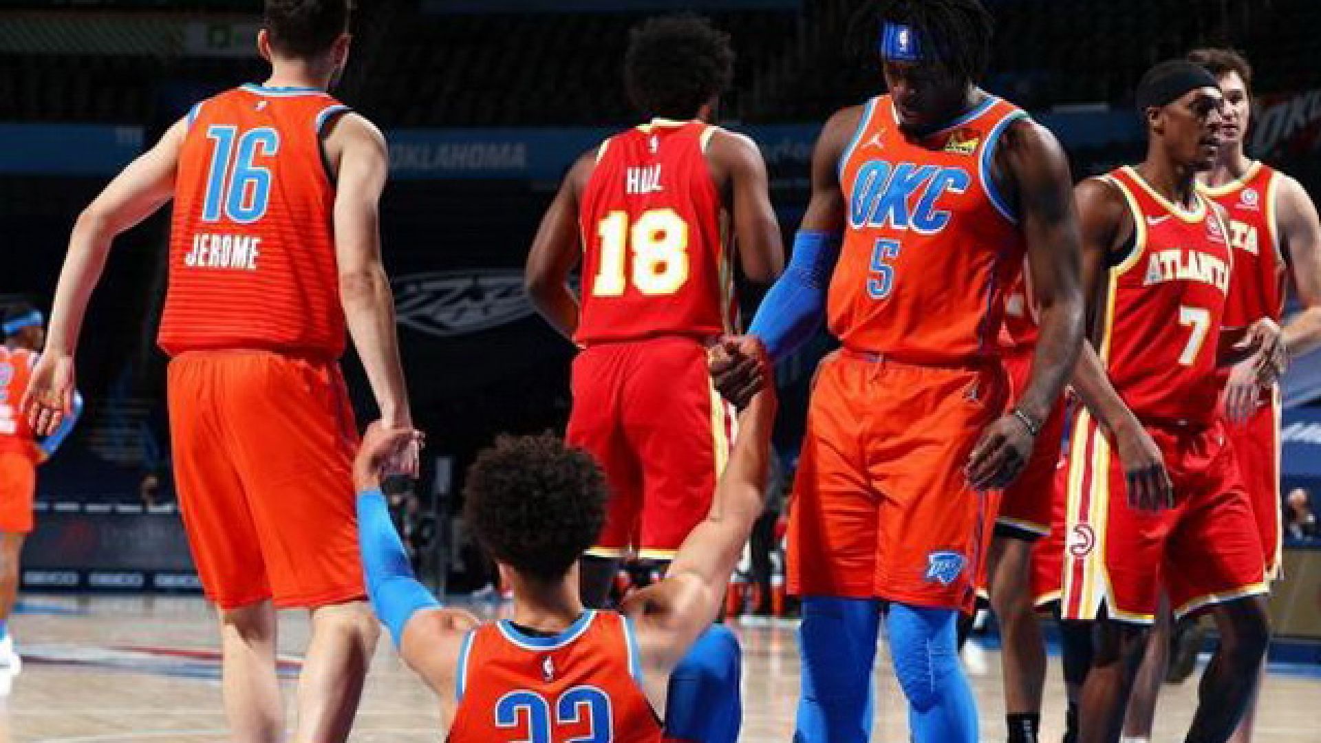 Το πρόβλημα προέκυψε από το γεγονός πως οι Χοκς ταξίδεψαν στην Οκλαχόμα μόνο με τις κόκκινες φανέλες τους και ενώ οι φανέλες των Θάντερ είναι πορτοκαλοκόκκινες, με αποτέλεσμα, για ένα ολόκληρο ημίχρονο να έχουμε στο παρκέ 10 παίκτες με σχεδόν ίδια χρώματα! Τελικά, το ζήτημα έληξε με το ξεκίνημα του β’ μέρους, καθώς η Οκλαχόμα αναγκάστηκε να αλλάξει εμφανίσεις και να φορέσει λευκά.