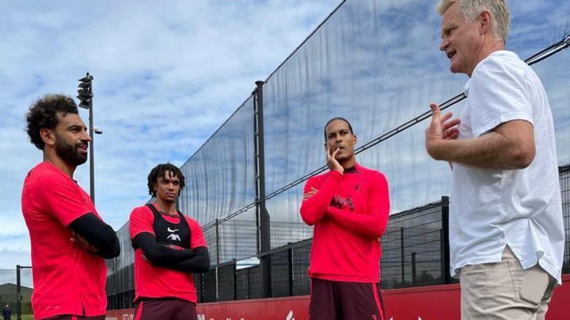 Ο προπονητής των Γουόριορς που αναδείχθηκαν πρωταθλητές του NBA, επισκέφθηκε τους «κόκκινους» και μάλιστα είχε ολιγόλεπτη συνομιλία με τους Σαλάχ, Φαντάικ και Άρνολντ.