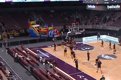 Πρωτοφανής εικόνα στη Λετονία στην αναμέτρηση Ρίγα-ΑΕΚ για το Basketball Champions League, καθώς πίσω από την μία μπασκέτα έχει τοποθετηθεί φουσκωτός παιδότοπος.