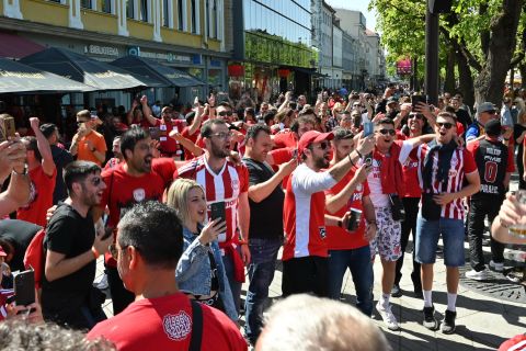 Ο Ολυμπιακός αντιμετωπίζει στις 20:00 την Ρεάλ Μαδρίτης, για τον μεγάλο τελικό της Euroleague, όμως το κέντρο του Κάουνας είναι ήδη… κατακόκκινο, με τους οπαδούς των «ερυθρόλευκων» να έχουν ξεκινήσει από νωρίς το τραγούδι.