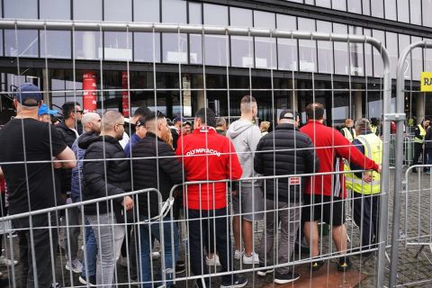 Οι φίλοι του Ολυμπιακού γεμίζουν τις θέσεις που τους αναλογούν και με τις φωνές και τα τραγούδια τους, αρχίζουν και μετατρέπουν σιγά – σιγά την «Zalgirio Arena» σε… ΣΕΦ.