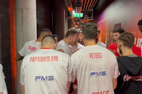 Το τελετουργικό που συνόδεψε τον Ολυμπιακό σε όλη την διάρκεια της σεζόν, δεν θα μπορούσε να λείψει από το Κάουνας, με τον Σάσα Βεζένκοβ να δίνει το σύνθημα και την… πεινασμένη ερυθρόλευκη αγέλη να ακολουθεί.