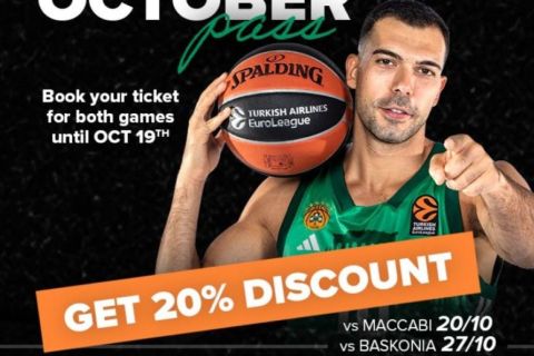 Στην κυκλοφορία από την ΚΑΕ Παναθηναϊκός, το October Pass, που προσφέρει έκπτωση 20% σε όσους το προμηθευτούν για τους αγώνες κόντρα σε Μακάμπι και Μπασκόνια.