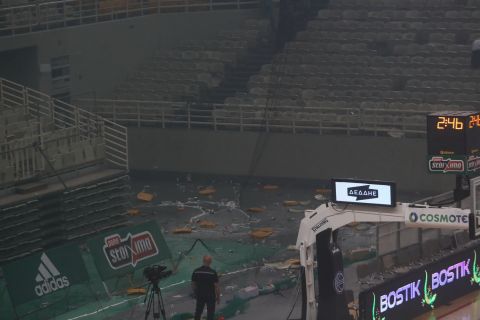 Οι διαιτητές του αγώνα διέταξαν την εκκένωση του ΟΑΚΑ για να συνεχιστεί και να ολοκληρωθεί ο τέταρτος τελικός της Basket League, με τους οπαδούς του Παναθηναϊκού, όμως, να συνεχίζουν την καταστρεπτική τους συμπεριφορά.