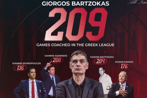 Ο Γιώργος Μπαρτζώκας συνεχίζει να γράφει ιστορία στο τιμόνι του Ολυμπιακού, καθώς, στο παιχνίδι με τον Κολοσσό, ο προπονητής των πρωταθλητών Ελλάδας συμπλήρωσε 209 αγώνες στον «κόκκινο» πάγκο, όντας πρώτος στην σχετική λίστα, ξεπερνώντας τον Γιάννη Ιωαννίδη.
