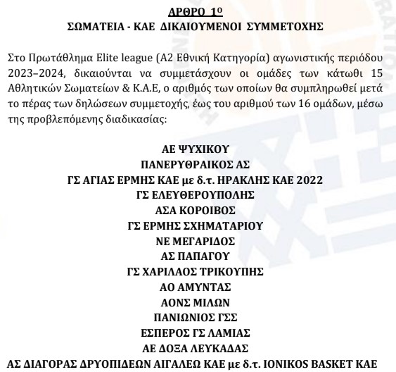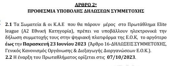 Η ΕΟΚ έδωσε στην δημοσιότητα την ειδική προκήρυξη για το πρωτάθλημα της Elite League, στην οποία αναγράφονται οι αλλαγές που θα ισχύσουν για την σεζόν 2023-24.
