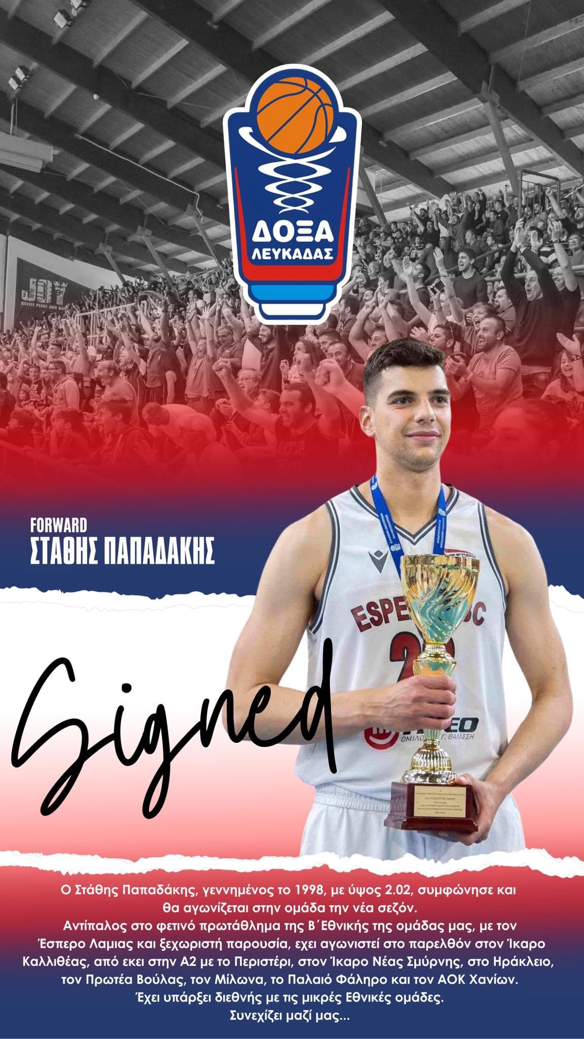 Η Δόξα Λευκάδας συνεχίζει την προσπάθεια ενίσχυσης ενόψει της νέας σεζόν στην Elite league με την απόκτηση του Στάθη Παπαδάκη.