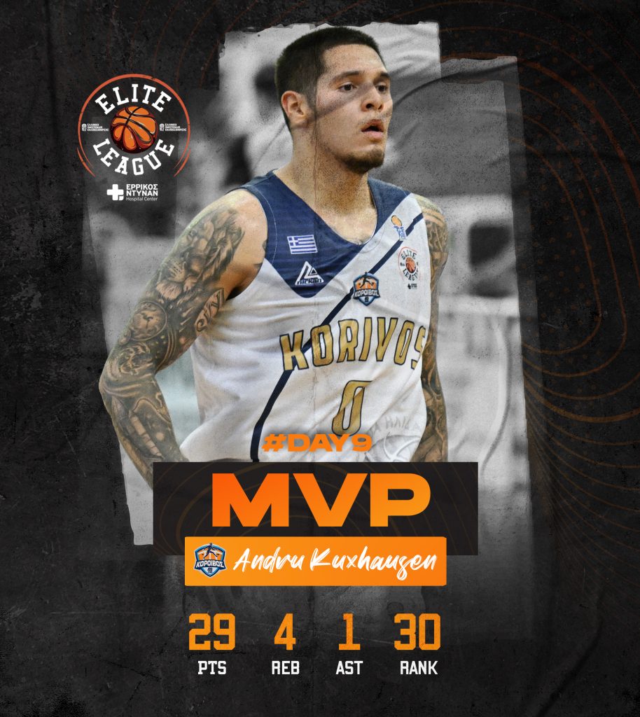 Στα χέρια του Ντρου Καξχάουζεν κατέληξε το βραβείο του πολυτιμότερου παίκτη της 9ης αγωνιστικής της Elite League, με τον 25χρονο γκαρντ του Κοροίβου, να συγκεντρώνει 30 βαθμούς στο σύστημα ranking, στην νίκη της ομάδας του επί του Ηρακλή.
