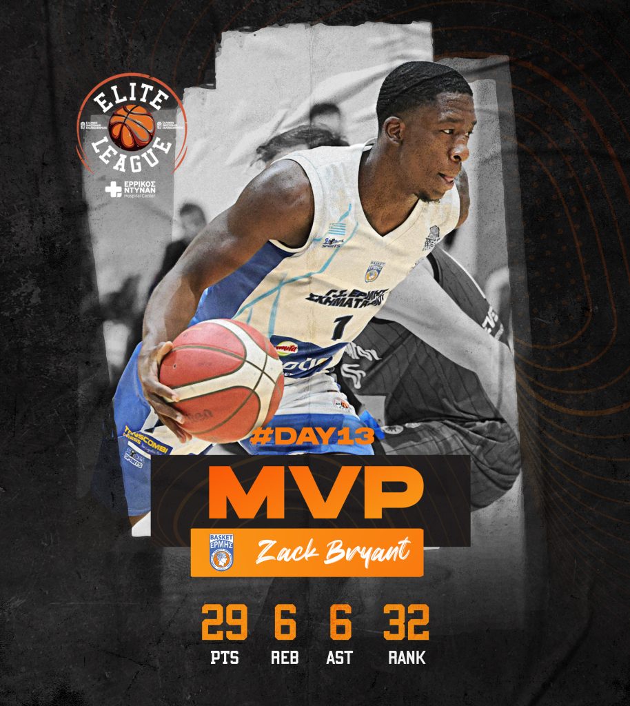 Ο Ζακ Μπράιαντ ήταν ο πρωταγωνιστής της νίκης του Ερμή Σχηματαρίου επί του Παπάγου με 83-75, με τον Αμερικανό γκαρντ να αναδεικνύεται MVP της 13ης αγωνιστικής.