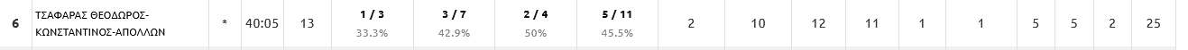 Ο παίκτης της ομάδας της Καισαριανής πραγματοποίησε triple double, έχοντας 13 πόντους, με 3/7 δίποντα, 2/4 τρίποντα και 1/3 βολές, αλλά και 12 ριμπάουντ (10 αμυντικά, δύο επιθετικά) και 11 ασίστ, σε μία ιστορική εμφάνιση, η οποία, δυστυχώς για τον ίδιο και την ομάδα του, δεν συνοδεύτηκε με νίκη.