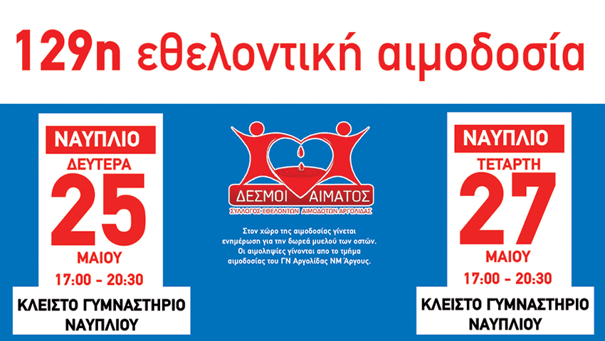 O Οίακας Ναυπλίου για ακόμη μια φορά δείχνει το σπουδαίο κοινωνικό του πρόσωπο, καλώντας αλεί τον κόσμο του να συμμετάσχει στην 129η τακτική εθελοντική αιμοδοσία, η οποία θα πραγματοποιηθεί τη Δευτέρα (25/05) και την Τετάρτη (27/05) στο κλειστό γυμναστήριο του Οίακα στο Ναύπλιο.