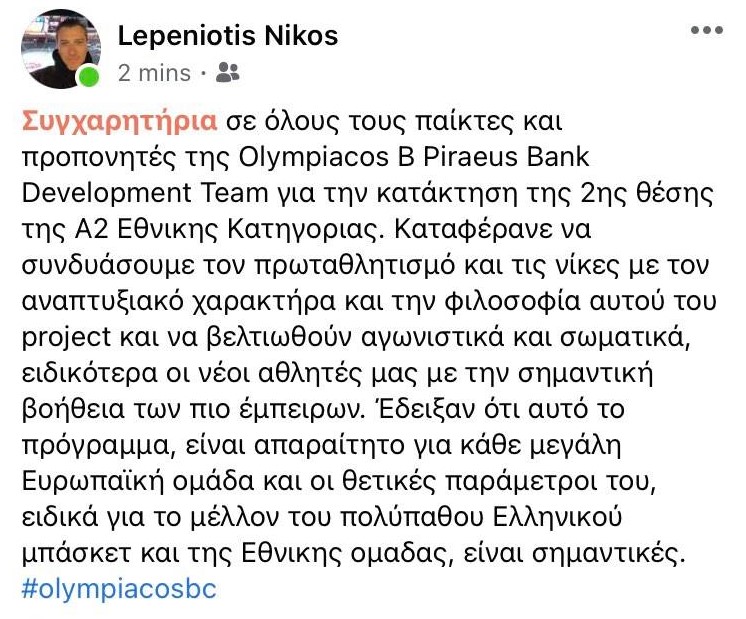 Αναλυτικά η ανάρτηση του Νίκου Λεπενιώτη αναφέρει ότι: "Συγχαρητήρια σε όλους τους παίκτες και προπονητές της Olympiacos B Piraeus Bank Development Team για την κατάκτηση της 2ης θέσης της Α2 Εθνικης Κατηγοριας. Καταφέρανε να συνδυάσουμε τον πρωταθλητισμό και τις νίκες με τον αναπτυξιακό χαρακτήρα και την φιλοσοφία αυτού του project και να βελτιωθούν αγωνιστικά και σωματικά, ειδικότερα οι νέοι αθλητές μας με την σημαντική βοήθεια των πιο έμπειρων. Έδειξαν ότι αυτό το πρόγραμμα, είναι απαραίτητο για κάθε μεγάλη Ευρωπαϊκή ομάδα και οι θετικές παράμετροι του, ειδικά για το μέλλον του πολύπαθου Ελληνικού μπάσκετ και της Εθνικης ομαδας, είναι σημαντικές. #olympiacosbc".