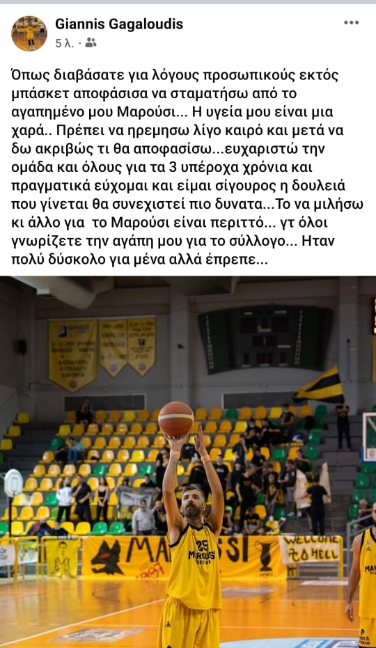 «Όπως διαβάσετε για λόγους προσωπικούς εκτός μπάσκετ αποφάσισα να σταματήσω από το αγαπημένο μου Μαρούσι.