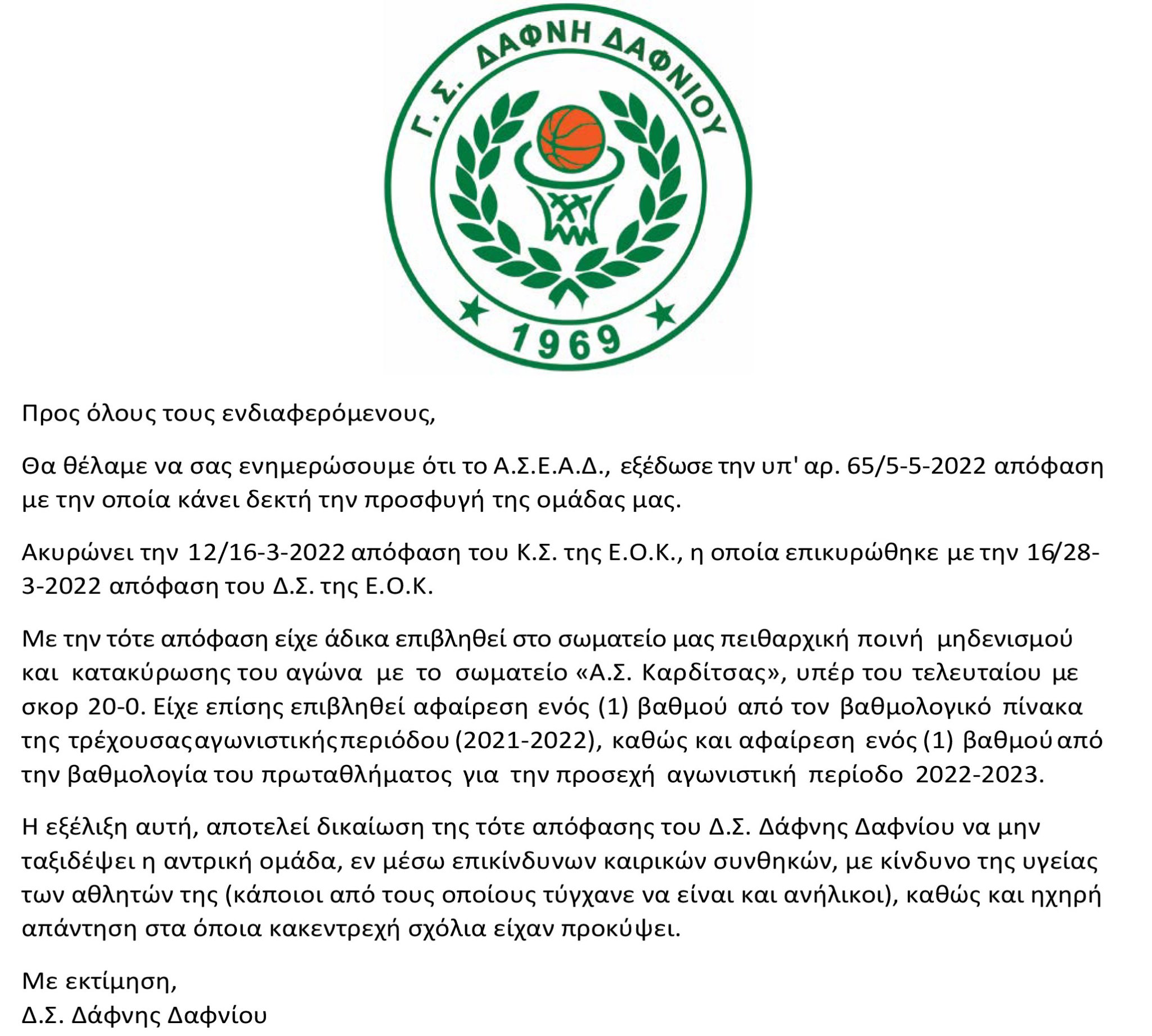 -Μετά την έκδοση απόφασης με υπ’ αρ. πρωτ. 65/05-05-2022 του ΑΣΕΑΔ, ο αγώνας ΑΣ Καρδίτσας – ΓΣ Δάφνη Δαφνίου για την Α2 Εθνική κατηγορία Ανδρών ορίζεται να διεξαχθεί στις 14/05/2022 και ώρα 15.00 στο νέο κλειστό γυμναστήριο Καρδίτσας.