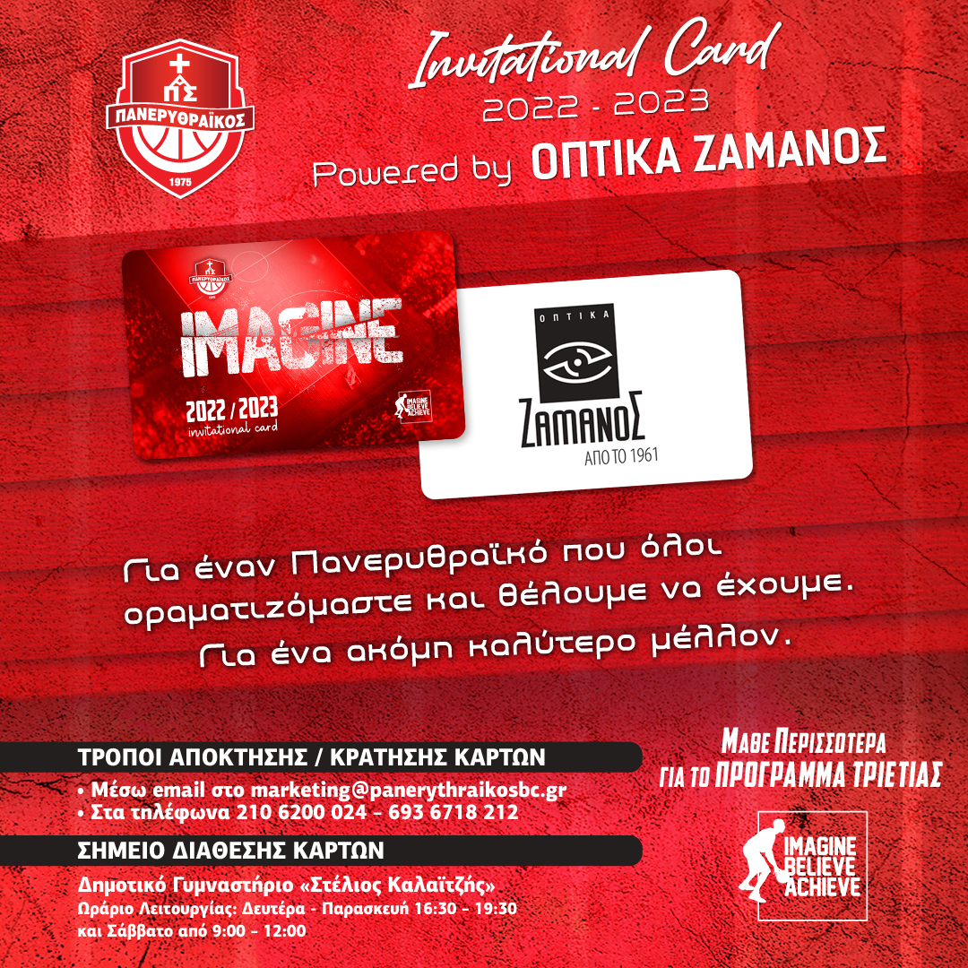 Με ανακοίνωση του, ο Πανερυθραϊκός ξεκινάει την διάθεση των Invitational Cards 2022 – 2023, ενώ παράλληλα παρουσιάζει το πρόγραμμα καρτών τριετίας, με στόχο την έναρξη εργασιών κατασκευής του νέου κλειστού γυμναστηρίου, την σεζόν 2024-25.