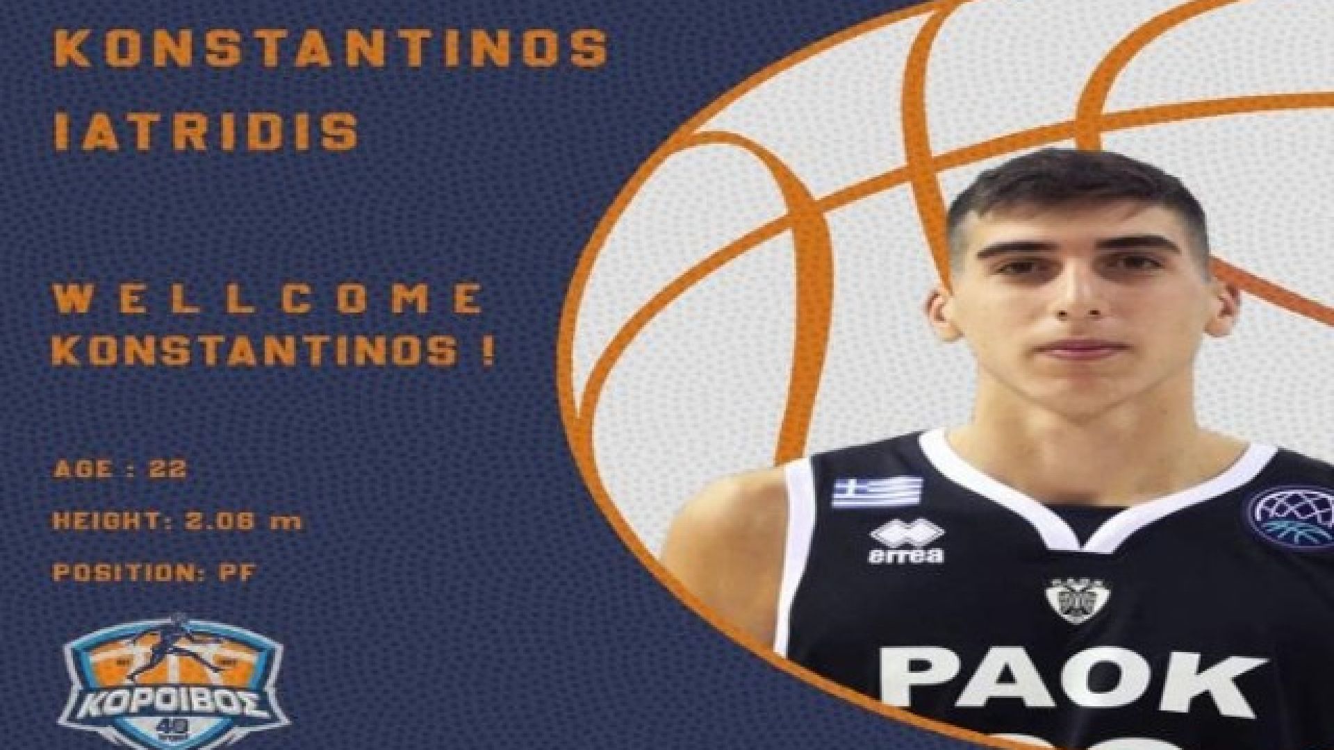 «Το τμήμα Καλαθοσφαίρισης του Α.Σ.Α Κόροιβος ανακοινώνει την συμφωνία με τον αθλητή Ιατρίδη Κωνσταντίνο για τα επόμενα 2 χρόνια. Ο Κωνσταντίνος είναι γεννηθεί το 2001, έχει ύψος 2.06 και αγωνίζεται στις θέσεις του power forward και center