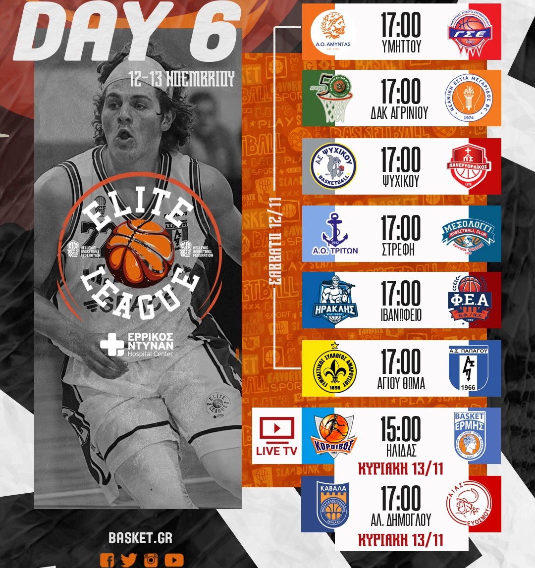 Με έξι αγώνες ανοίγει το Σάββατο 12/11 η αυλαία της έκτης αγωνιστικής στην Elite League Ερρίκος Ντυνάν. Κοινή ώρα έναρξης όλων των αγώνων είναι 17:00, ενώ η αγωνιστική ολοκληρώνεται την Κυριακή 13/11 με δύο ακόμη αναμετρήσεις.
