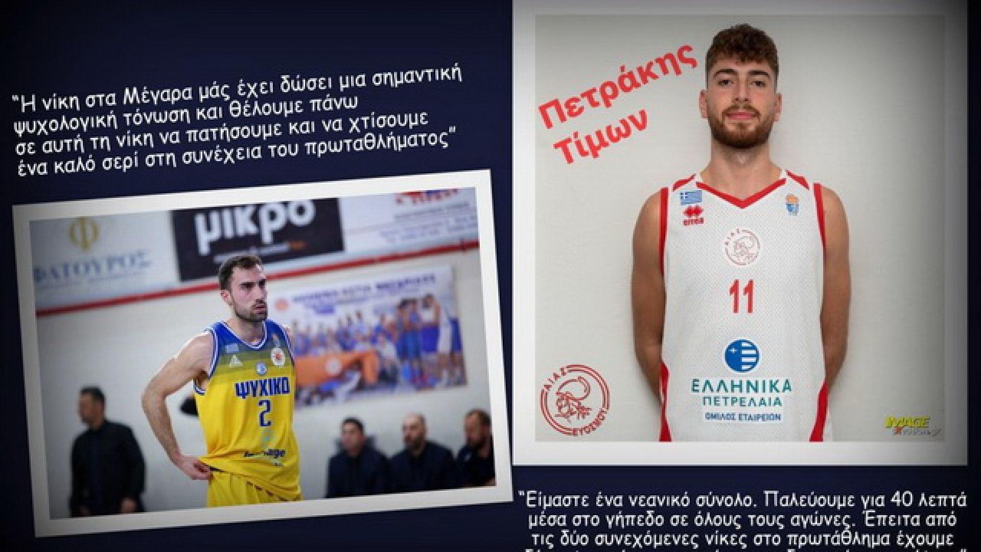 Στην άλλη πλευρά, ο Αίας προέρχεται από την ήττα στον Εύοσμο από την ΦΕΑ για το Κύπελλο αλλά στο πρωτάθλημα έχει καλό μομέντουμ με σερί δύο νικών. «Είμαστε ένα νεανικό σύνολο και παλεύουμε για 40 λεπτά μέσα στο γήπεδο σε όλους τους αγώνες. Έπειτα από τις δύο συνεχόμενες νίκες στο πρωτάθλημα έχουμε ένα δύσκολο πρόγραμμα αγώνων με δυνατούς αντιπάλους. Θα δώσουμε τον καλύτερο μας εαυτό, εφαρμόζοντας τις τακτικές των προπονητών για να πάρουμε το καλύτερο δυνατό αποτέλεσμα», ανέφερε ο 23χρονος φόργουορντ Τίμος Πετράκης.
