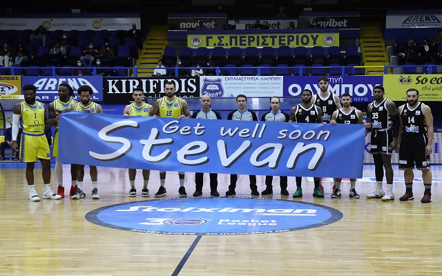 Πριν από τις αναμετρήσεις Περιστέρι-Απόλλωνας Πάτρας και Προμηθέας-Κολοσσός οι αθλητές της Basket League κράτησαν ένα πανό για να δείξουν τη συμπαράστασή τους στον Στέβαν Γέλοβατς ο οποίος βρίσκεται στο νοσοκομείο.