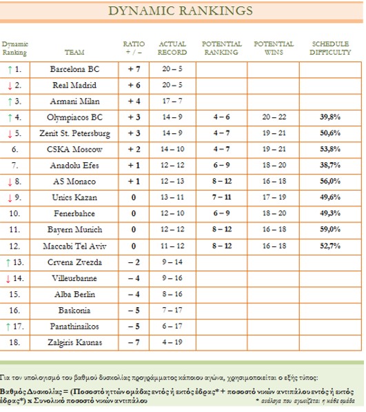 Με την ευκαιρία της διακοπής της Euroleague για μια εβδομάδα και λίγο πριν την τελική ευθεία της κανονικής περιόδου, όπου θα κριθεί η τελική κατάταξη, με τις «μάχες» για το πλεονέκτημα έδρας και την είσοδο στην 8αδα να μαίνονται, ήρθε η ώρα για το αφιέρωμα που όλοι περιμένατε! Στο σημερινό κείμενο και δεδομένου ότι ο Ολυμπιακός φέτος διεκδικεί με αξιώσεις την πρόκρισή του στα Ρ/Ο, θα εστιάσουμε στους 9 μονομάχους, που παλεύουν για τις (κατά τα φαινόμενα) 5 διαθέσιμες θέσεις. Η βάση της ανάλυσής μας θα είναι η «δυναμική βαθμολογία», όπως σας την έχουμε παρουσιάσει και άλλες φορές (η κατάταξη των ομάδων σύμφωνα με το συντελεστή + / – , δηλαδή αν από τις εκτός έδρας νίκες τους αφαιρεθούν οι εντός έδρας ήττες).