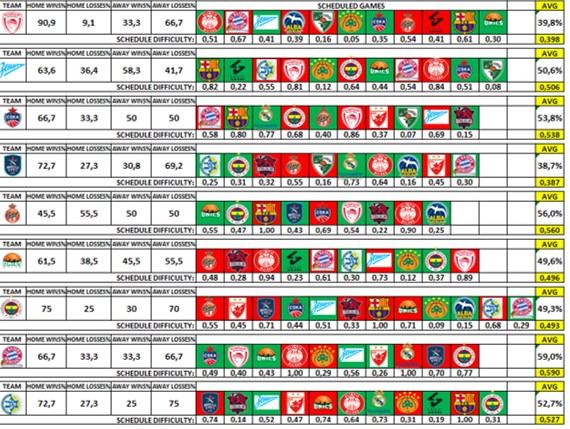 Ωστόσο, αυτή τη φορά έχουμε εμπλουτίσει τον πίνακα με μια πολύ σημαντική παράμετρο, όσο πλησιάζει το «κλείσιμο» της Regular Season, ήτοι το υπολειπόμενο πρόγραμμα κάθε ομάδας και το βαθμό δυσκολίας του. Προτού προχωρήσουμε στην επεξήγηση της μεθοδολογίας, θα πρέπει να διευκρινίσουμε κάποια δεδομένα. Το πρώτο είναι ότι για το συγκεκριμένο κείμενο, δεν έχουν επιλεχθεί οι τρεις πρωτοπόροι (Barcelona, Real, Armani) που σχεδόν μαθηματικά εξασφάλισαν όχι μόνο την πρόκριση, αλλά και το πλεονέκτημα έδρας (με μικρό ερωτηματικό όσον αφορά την Armani), καθώς και οι ομάδες που πλέον έχουν μείνει πίσω στο κυνήγι της 8αδας.