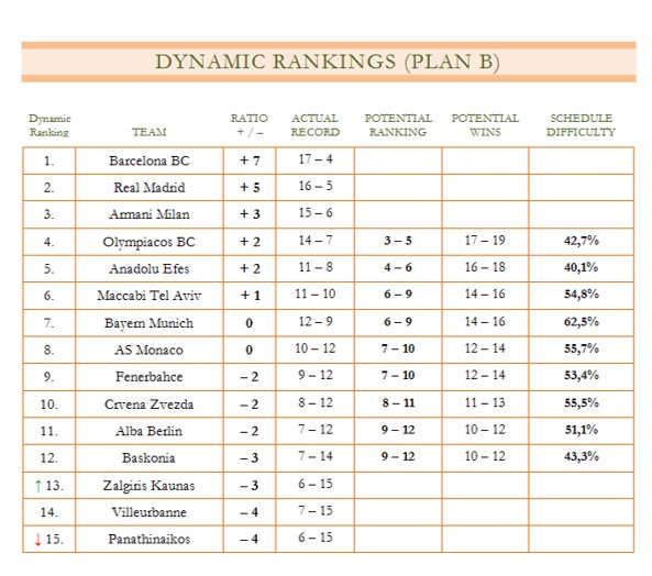 Φυσικά το έργο των ερυθρόλευκων είναι δύσκολο, έχοντας και αυτοί σε σύνολο 7 παιχνιδών, 5 εκτός έδρας. Τα 3 επόμενα ταξίδια σε Μόναχο, Βερολίνο και Κάουνας είναι αυτά που θα κρίνουν και τους στόχους της ομάδας. Με παραπάνω από 1 νίκη σε αυτούς τους αγώνες, ο Ολυμπιακός θα μπορεί να κοιτάζει ψηλότερα από την 4η θέση, κάτι που μεσοπρόθεσμα ίσως αποδειχθεί καθοριστικό, αποφεύγοντας μια πιθανή διασταύρωση με την Efes. Πάντως, ο Ολυμπιακός μόνο με θαύμα θα πέσει κάτω από την 5η θέση και του αρκούν 2 – 3 νίκες ακόμη για να εξασφαλίσει αυτό το πλασάρισμα. Η εκτίμηση μου είναι ότι αν καταφέρει να πάρει 3/5 εκτός έδρας και κερδίσει τον ΠΑΟ στο ΣΕΦ, τότε η 3η θέση θα «παιχτεί» με την Barcelona την τελευταία αγωνιστική, σε διαφορετική περίπτωση, θα πρέπει να κοιτάξει να διασφαλίσει έστω την 4η για να έχει στα χέρια του το πολύτιμο πλεονέκτημα έδρας!