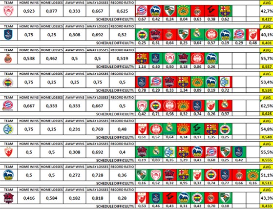 Η Fenerbahce έχει μείνει αρκετά πίσω, με ρεκόρ 9 – 12 και συντελεστή – 2. Πλέον, με 7 αγώνες να απομένουν (με βαθμό δυσκολίας 53,4%), κάθε άλλο παρά κρατάει την τύχη στα χέρια της. Ζητάει τουλάχιστον 5 νίκες στα επόμενα παιχνίδια και επικράτηση οπωσδήποτε επί της Bayern (ιδανικά με + 9). Η Τουρκική ομάδα διαθέτει την ποιότητα μεν, πρέπει να κάνει υπέρβαση στη συνέχεια δε. Η αναμέτρηση με την Efes μπορεί να είναι ορόσημο, καθώς με νίκη, εκτός της καλής ψυχολογίας, θα κάνει άλμα για την 8η θέση. Αν δεν τα καταφέρει, το παιχνίδι με την Bayern είναι «τελικός» και στη συνέχεια θα πρέπει να πετύχει επίσης το διπλό με την Baskonia και να διαφυλάξει την έδρα της στους αγώνες με ΠΑΟ και Alba, για να έχει πιθανότητες να διεκδικήσει την πρόκριση. Δεν ξέρω αν ο Djordjevic θα «αγόραζε» το ενδεχόμενο, η είσοδος στα Ρ/Ο να κρίνεται την τελευταία αγωνιστική στο παιχνίδι με τη Maccabi, με τη νίκη να σημαίνει πρόκριση και την ήττα, αποκλεισμό, αλλά είναι ίσως το πλέον επιθυμητό και πιθανό σενάριο για τη Fenerbahce…